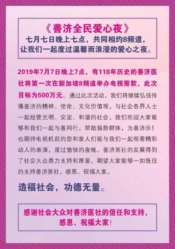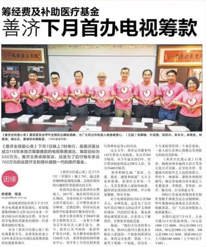 2019年7月7日7点,有118年历史的善济医社将第一次在新加坡举办电视筹款,而这次的筹款目标是500万新元。