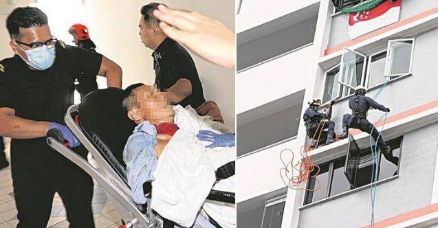 金文泰男子反锁家中,被指挥刀自捅胸口,特警撞门入屋夺刀,将男子紧急送院急救。这起事故发生在昨天(7月31日)下午3时38分,地点在金文泰2道第330座组屋八楼的四房式单位。本报接获读者通报,称楼下有民防人员在组屋前后铺设气垫,现场也有出现多名特警,气氛紧张。记者赶到现场后,刚好听到多次“碰!碰!”的巨响,相信当时特警撞门而入,跟着两名民防人员从十楼撒网下来,另两名吊着绳索的民防人员攀到八楼窗户按紧窗叶,防止屋内男子夺窗而出,还有两名民防人员在七楼窗口接应,以防万一。当特警冲进屋里,事发单位传来多次喊声,跟着突然一片寂静,引起居民议论纷纷,不知道单位里发生什么事。