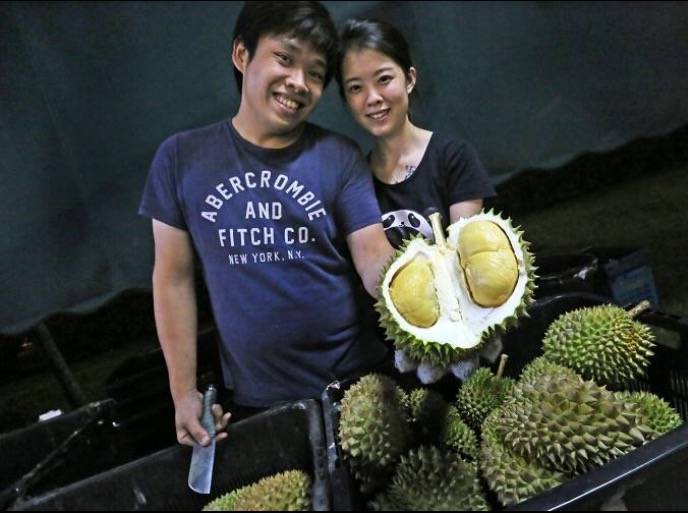 “由于本季节供应商找给我们的榴梿品种都不错,也因为结婚两周年想庆祝,又发现挺多老顾客从我们在武吉巴督营业时期就开始一路支持我们,至今有四五年,所以想答谢他们。”两人原本担任宴会经理,并在酒店管理领域结识,如今两人都已辞职,全心打理榴梿摊的生意。