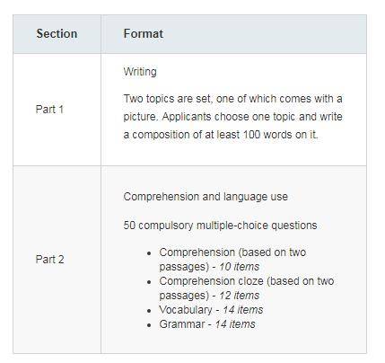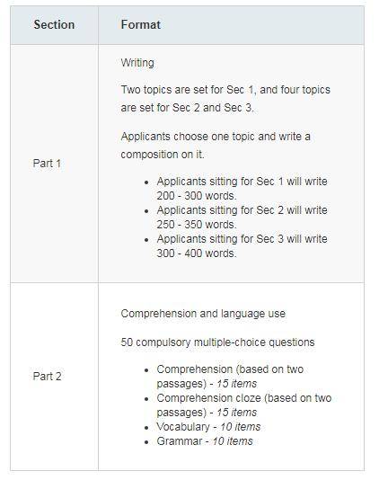 考试时长两小时十分钟,第一部分为写作,中一学生要求200-300个单词,中二学生要求250-300个单词,中三学生要求300-400个单词~写作要求比较高哦~
