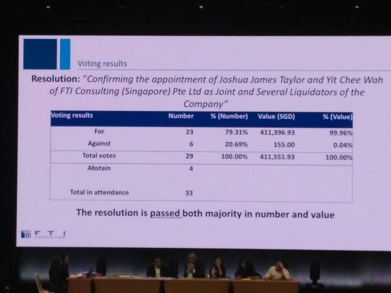 出席者也在场投票,最终以23票对6票,将原本为oBike临时清盘人的富理诚公司(FTI Consulting)委任为正式清盘人。