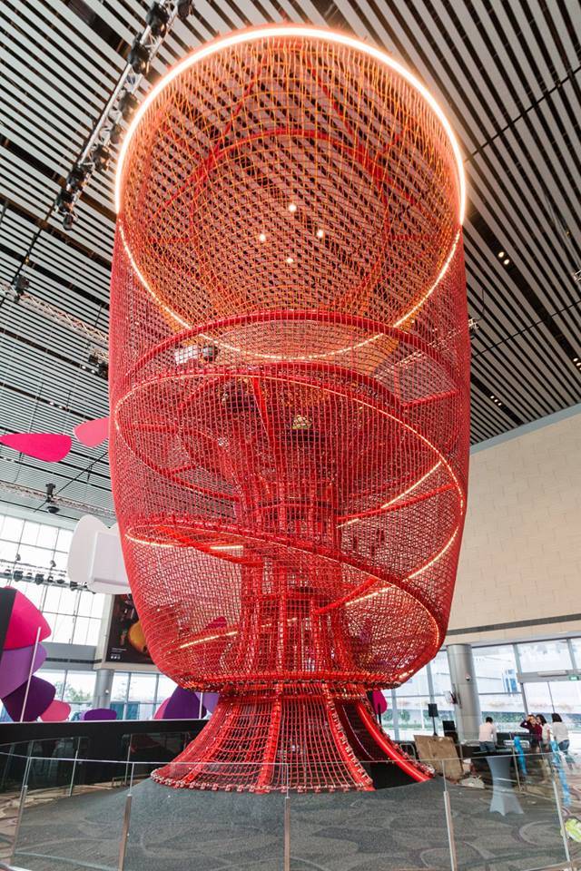 外形像巨型红色吊灯的游乐设施16米高、10米宽,儿童和成人能攀爬绳子组成的绳网,还能溜滑梯。