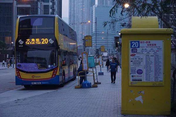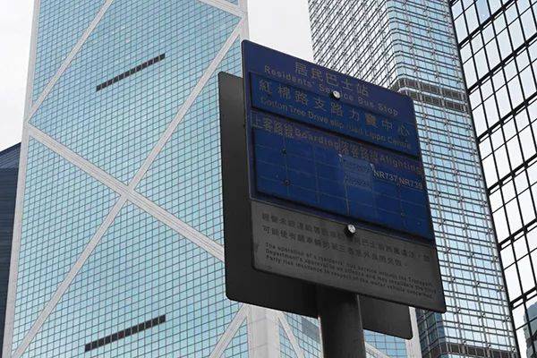 居民巴士车站,可以看到取消线路的痕迹,2019年1月摄于金钟,背景即是贝聿铭设计的中银大厦。