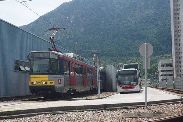 轻铁屯门车厂内并列的港铁巴士和轻铁列车,摄于2019年6月。