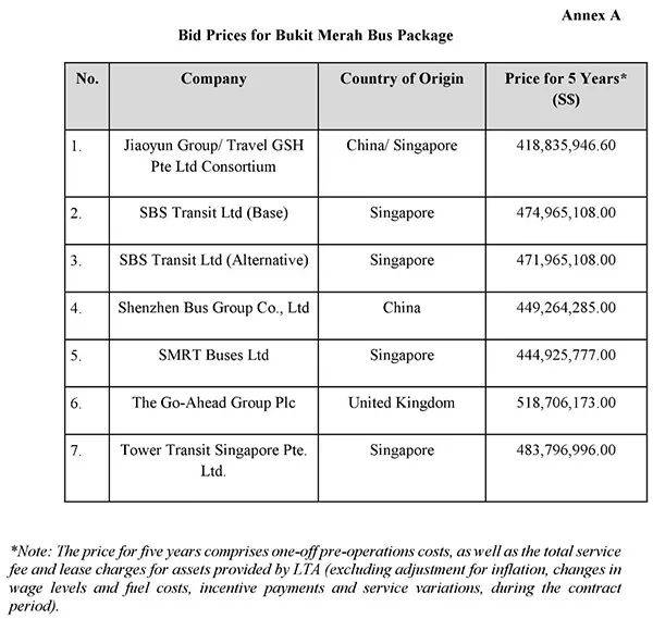 武吉美拉(Bukit Merah)巴士标包的投标价一览,可见有交运集团(青岛)和深圳巴士集团参与,出价并非最低的新捷运(SBS Transit,新加坡本地企业)最终中标(来源:Land Transport Authority/新加坡陆路交通管理局)
