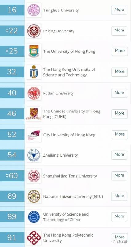 清华大学是中国排名最高的学府,自去年首次冲进前20名,后再上升至16名,超过了耶鲁大学(17)和哥伦比亚大学(18)2座藤校。