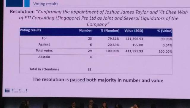 虽然记录上他不是董事,但据我了解,他在新加坡业务上有很多掌控权。” “有一点失望,因为到现在我们还不太了解,我们可不可以拿回我们那笔钱。”出席者也在场投票,最终以23票对6票,将原本为oBike临时清盘人的富理诚公司(FTI Consulting)委任为正式清盘人。
