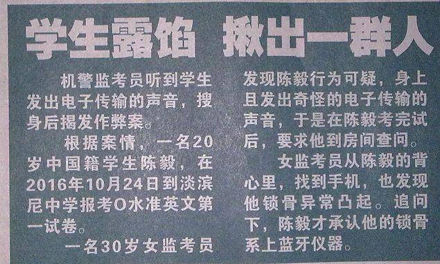 案件是在2016年10月24日被揭发。其中一名学生,20岁的陈义进行英文第一试卷时,因耳机传来的电子噪音而被考官发现。
