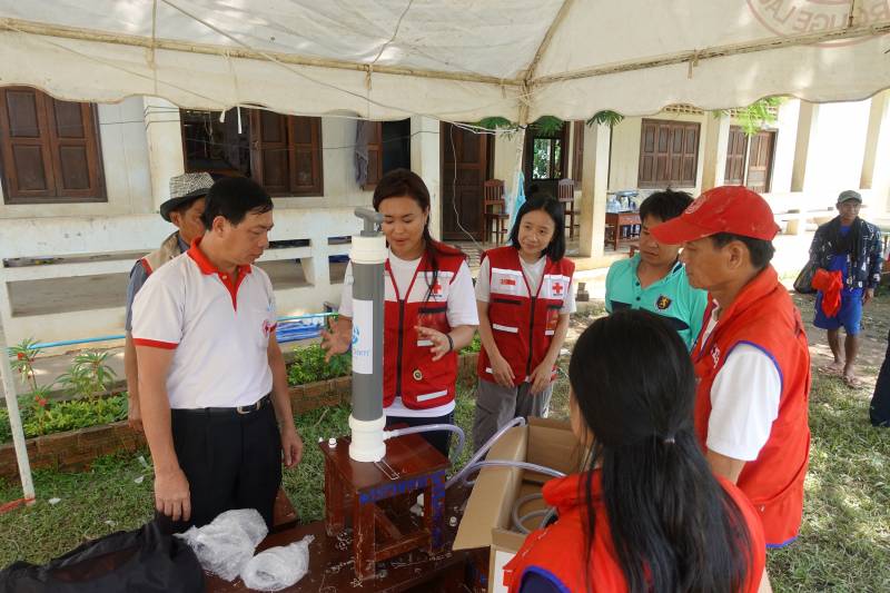 广告两人到当地一所被用作疏散中心的中学,向老挝红十字会示范如何使用滤水器。该“超级滤水器”可以在一小时内净化200升的水,足够100人使用。这三个滤水器将被分配到不同的疏散中心。