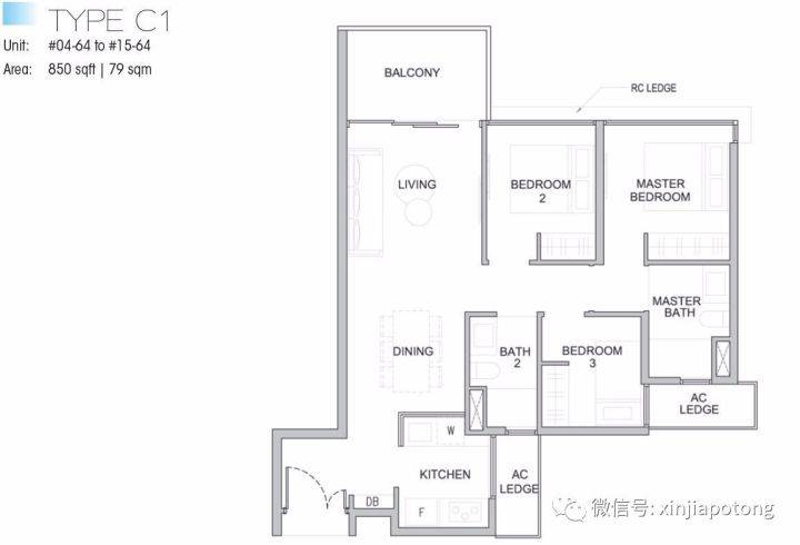 三房户型图,79平方米/850平方英尺,带传统封闭式厨房,厨房和卫生间都带窗口,实用型设计,价格114.1万新币起
