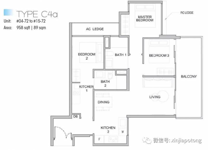 三房户型图,89平方米/958平方英尺,开放式厨房,价格128.6万新币,实用型设计.