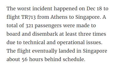 *酷航最严重的晚点事件发生在12月18日,从雅典飞往新加坡的TR713航班。由于技术和运营问题,共有321名乘客登机和下机至少3次。这次飞行最终落地新加坡,晚点约56小时。