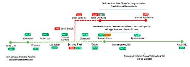 在这期间,沿着Buona Vista和Joo Koon地铁站之间的路段以及Bukit Gombak到Jurong East地铁站之间都将有接驳巴士服务。
