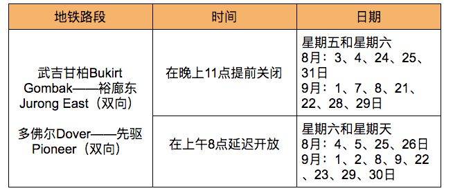 SMRT宣布:为了对部分轨道进行新信号系统维护和更新工作,2018年8月和9月,地铁东西线(EWL)从Dover到Pioneer的7个地铁站以及南北线(NSL)从Bukit Gombak到Jurong East的3个地铁站将会在星期五和星期六提前到晚上11点关闭,并在周六和周日延迟到上午8点开放。