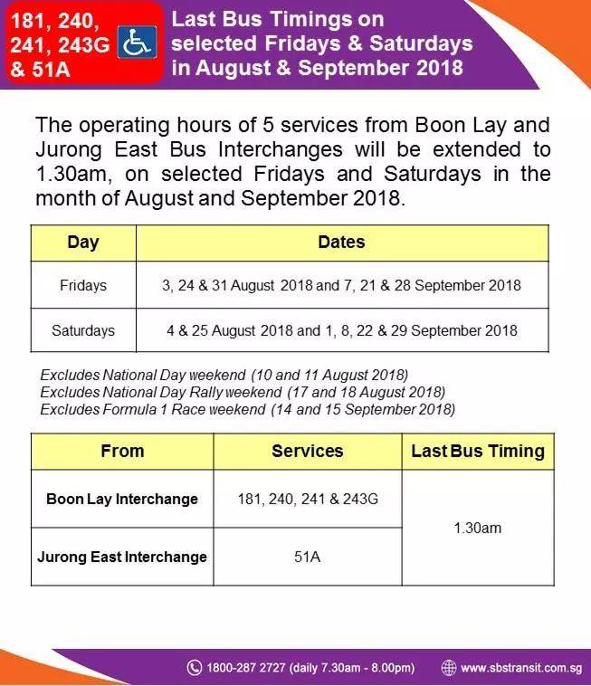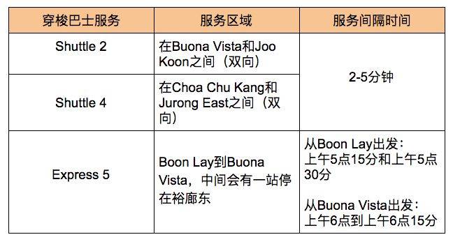 此外,从Boon Lay到Buona Vista之间还有公交快线服务提供,中间会在Jurong East停靠,具体信息如下: