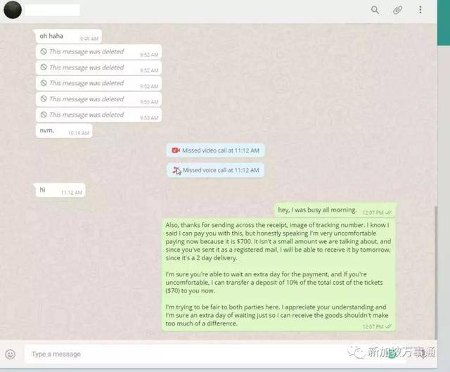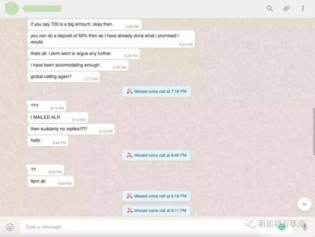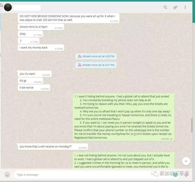 而且,卖方一改之前的和善态度,提出Christine应该在她寄票前说明要求,并态度强硬要求她按时转账,并多次通过WhatsApp发送信息和拨打语音通话催促。