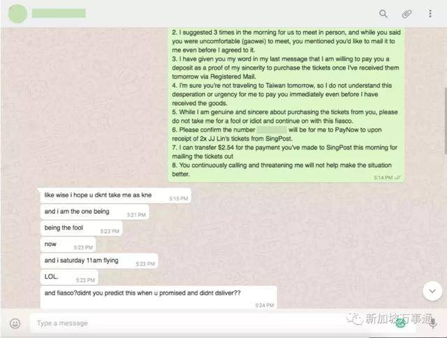 门票寄出后,Christine在朋友的提醒下,决定货到才付款,并发信息给卖方表示希望对方多等一天,因为700新元并不是一笔小钱,等自己收到门票后再转账给对方。为了表示诚意,Christine还表示,她可以先转账票价的10%,也就是70新元作为保证金,这样对双方来说都很公平。对此,卖方则表示难以接受,认为这很不公平。