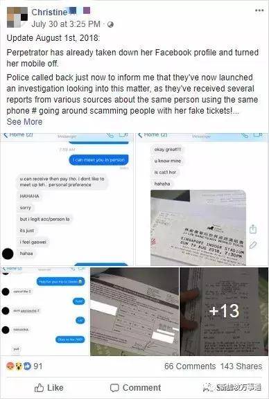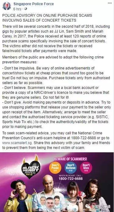 如果你以为Christine的经历只是个案,那就太天真了!其实这种骗术在新加坡非常常见,这一系列的演唱会门票诈骗案件引起了警方注意,就在今天(8月3日),新加坡警方在Facebook上发布文告表示, 2017年共接获至少120起跟网购演唱会门票有关的诈骗案。