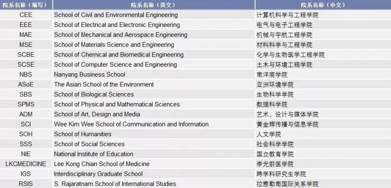 下图为NTU各个学院的缩写和全称,智选君会挑选一些同学们最常咨询的院系及课程,为大家做上详细介绍。