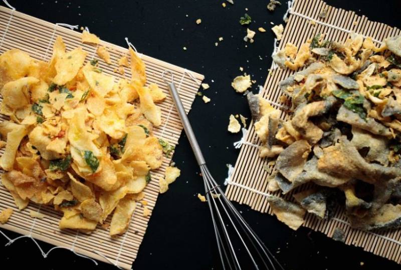 在鱼皮或土豆上擦上一层橄榄油,再撒上一点海盐,最后用空气炸锅炸,让它们不会那么油腻。吃起来酥脆爽口~