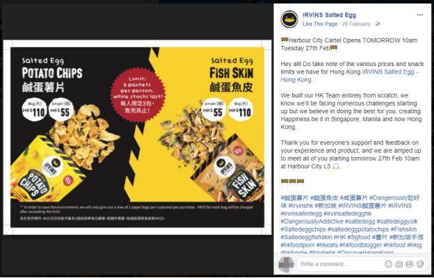 Irvins咸蛋黄不仅在新加坡有分店,在菲律宾也有分店。今年2月,更是进军到香港,在香港尖沙咀海港城(Harbour City)开了第一家店。
