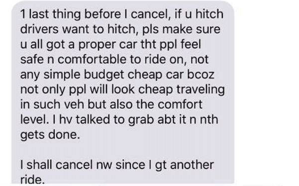到这,乘客还没有很爽快地取消订单,而是继续说:如果GrabHitch司机想载客,那就应该先确保你们的车让人觉得舒服和安全,而不是用廉价的车载人。因为这不仅让人看起来觉得很cheap,而且舒适度也很不好。