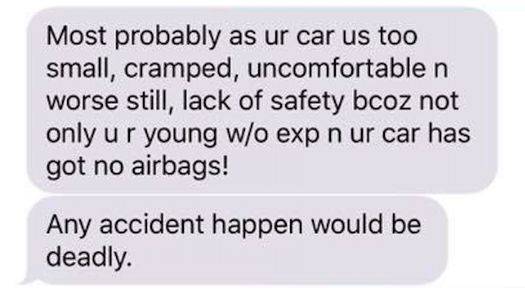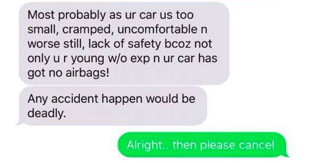 而乘客并没有很爽快地取消订单,而是抱怨了很多,例如她很怀疑车子太小、太狭窄、不舒服,觉得这位乘客太年轻,没有太多驾驶经验,但是如果有任何事故发生,这都可能是致命的。