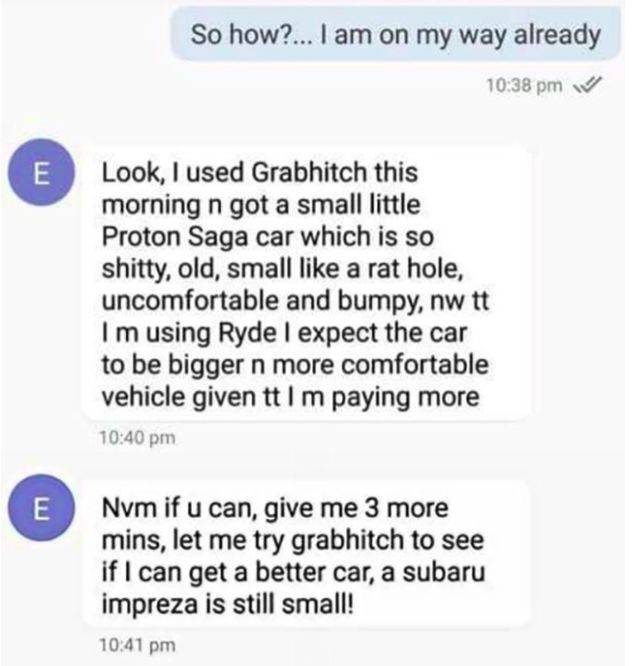而且当司机问她怎么办,自己已经在路上了,乘客的回复有点让人觉得情商堪忧。她一边抱怨车子太小,一边问司机能不能给她3分钟时间,让她看看grabhitch上有没有更好的车……