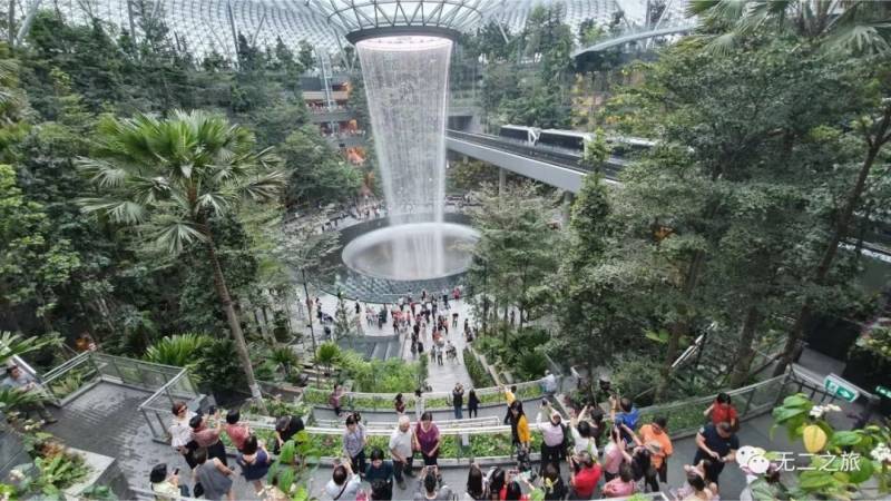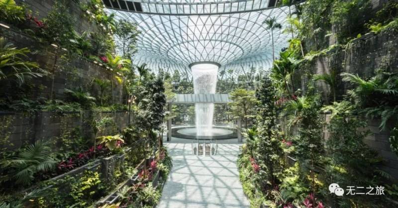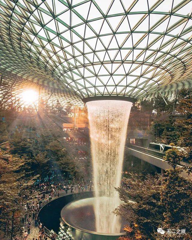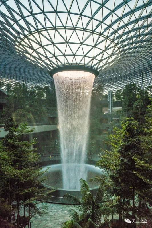 从玻璃穹顶倾泻而下的瀑布,水雾氤氲,和旁边的森林谷一起,幻化成了如梦如幻的仙境。