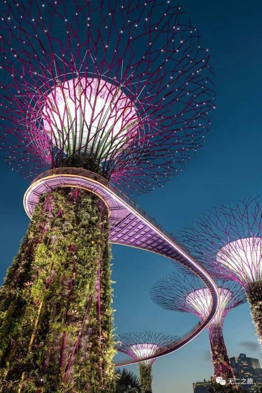 滨海湾公园是新加坡花费六年时光,耗资十亿打造的超级花园。冲入云霄的超级树绚丽奇幻,奇花异草四散在花宆中,全球最大的人造瀑布直冲而下,水雾缭绕。行走其间,仿佛步入超现实的科幻世界。