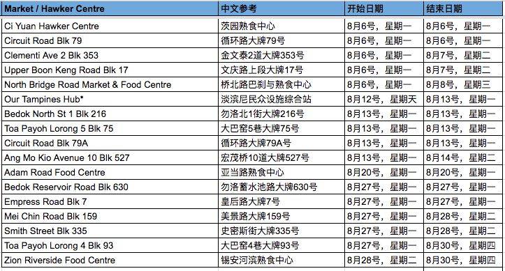 8月,国家环境局NEA仍将继续对食阁进行例行的大清扫。清扫期间,以下食阁将在这些日期里不营业。清扫时间主要集中在6日至30日这几天。
