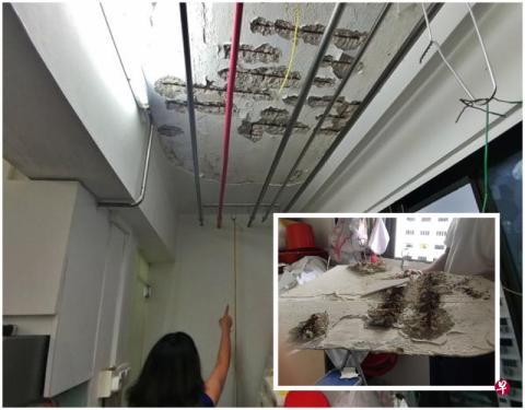 友诺士组屋天花板突然坍塌!女屋主在煮猪肚汤时,突然听到巨响,差点被一米宽、两米长的天花板砸中,幸好被架子上的竹竿挡住,险过剃头。