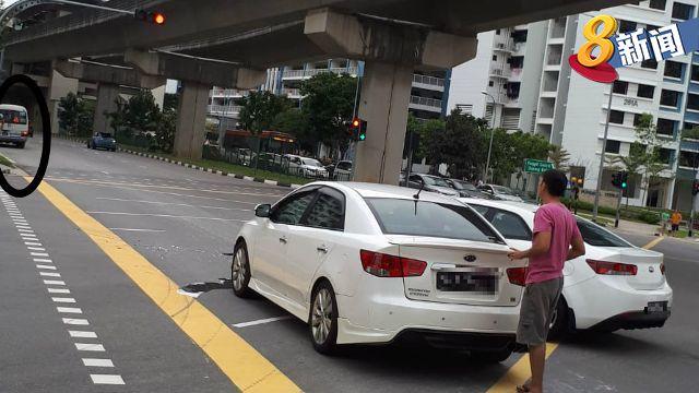 根据他所传来的照片显示,两辆轿车停在路中央的黄格子,而在照片的左下方,有一些轮胎紧急刹车后留下的痕迹。照片上,左边的白色轿车车头处,有些零件因碰撞而散落马路,而右边轿车的车头则靠向这辆轿车。一名男子站在车后检查情况,远方可看到小巴停靠在路旁。