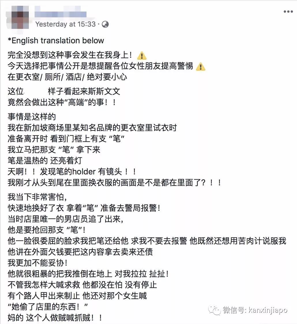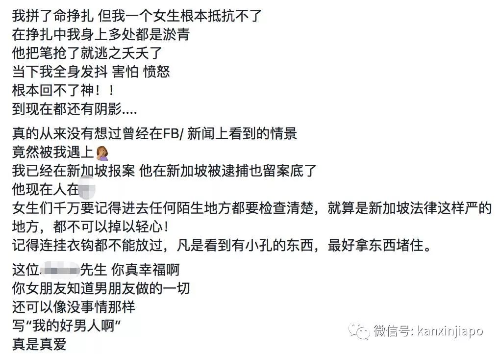 该名网友将此事在网上曝光,就是为了提醒女生们,就算是在新加坡这样治安好、法律严的地方,也会有这样的事情发生。
