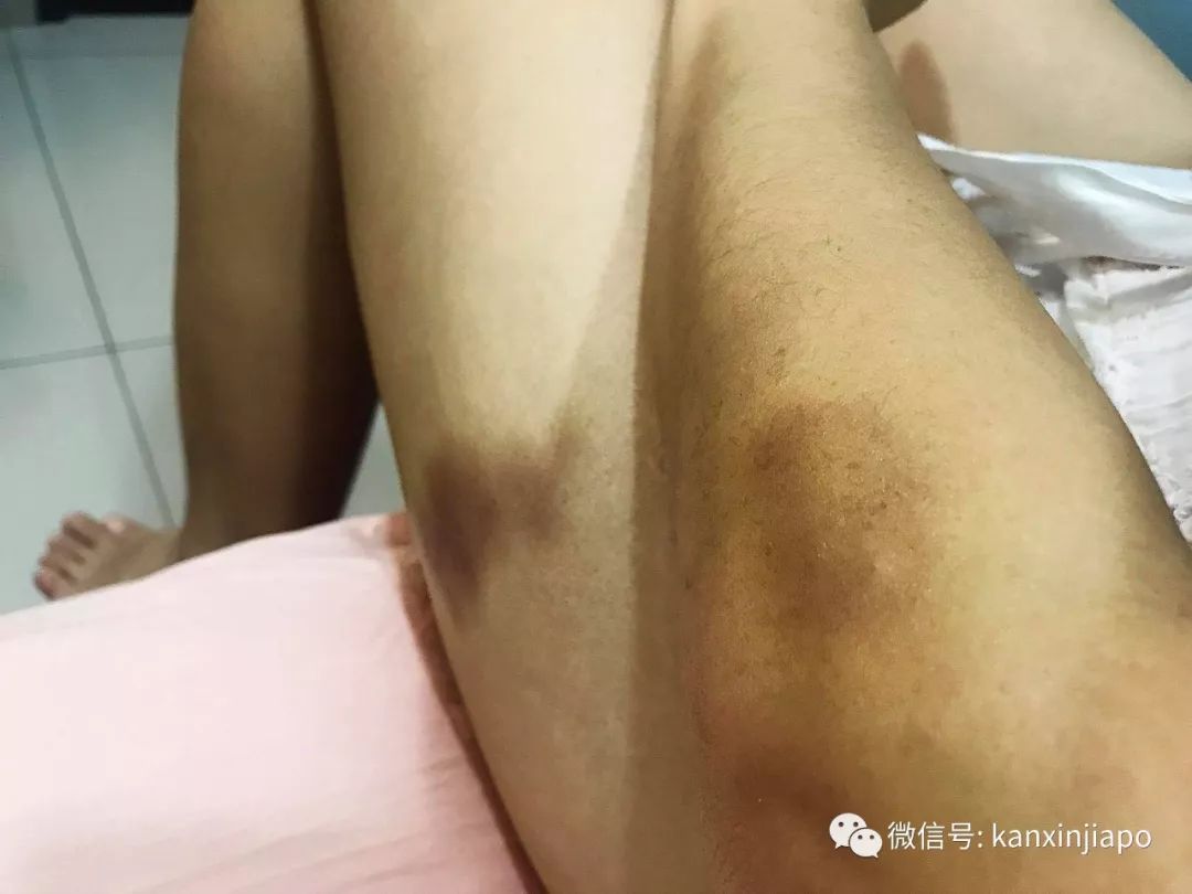在抢夺东西的过程中,网友被推倒在地,造成身上多处淤青。