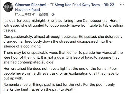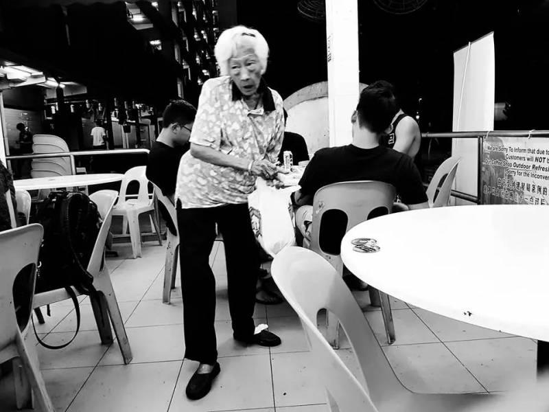 一个身体已经严重弯曲的新加坡安娣,在Havelock Road大牌22号的食阁里,依然挨桌挨椅地兜售纸巾,重点是,当时已经是深夜!