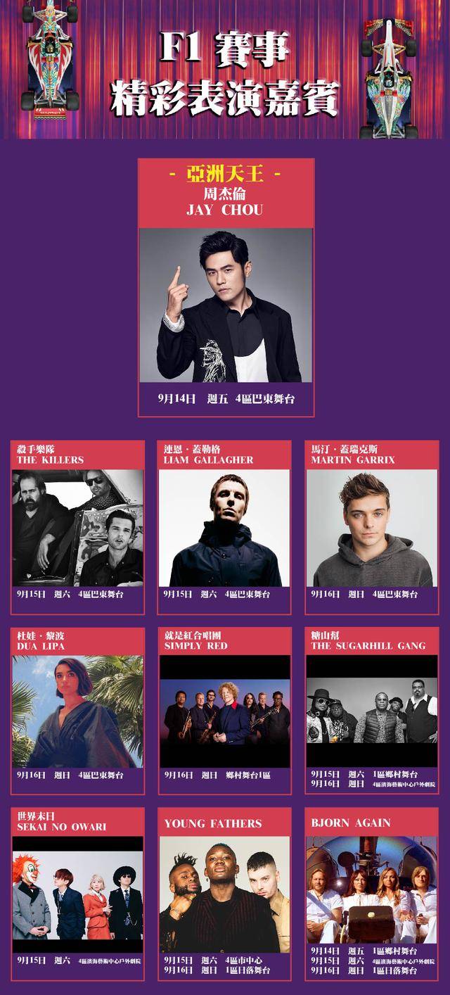 赛事将会进行一系列的演唱会,并邀请了多位巨星和乐队前来表演,当中包括周杰伦,The Killers和Liam Gallagher等。