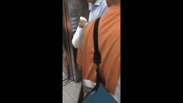 中年男子看着拍摄者无动于衷,反复试图用脚把他赶出去。同时嘴里还念念有词。“我不喜欢和印度人一起乘电梯,出去出去!”