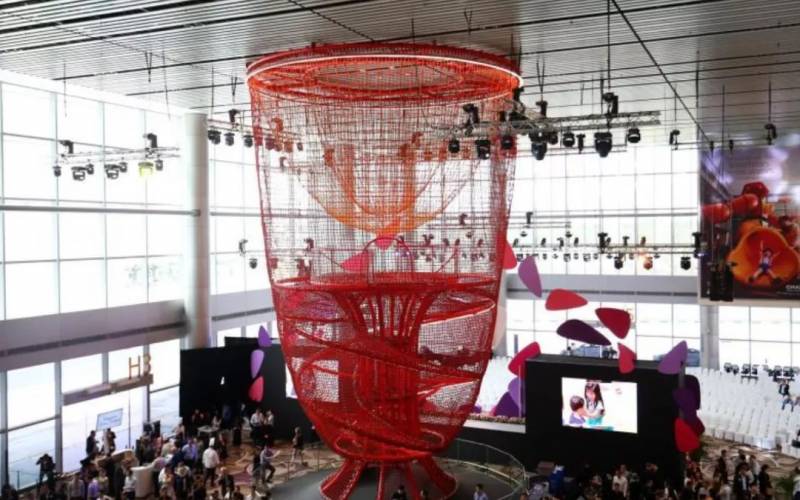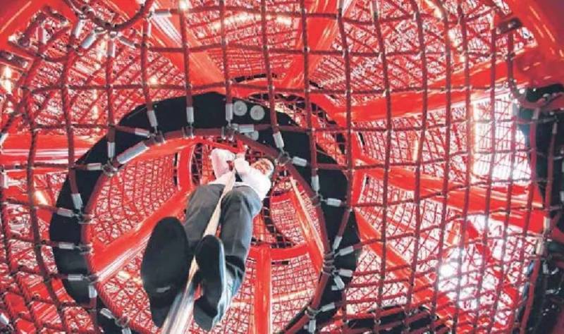 这个装置结合了双螺旋设计,高16米,宽10米,顶天立地,宛如一个从空中垂下的巨型吊灯。看起来很轻盈的设施,其实是用重达15吨的钢铁支撑,缠绕钢铁的缆绳长约10公里。