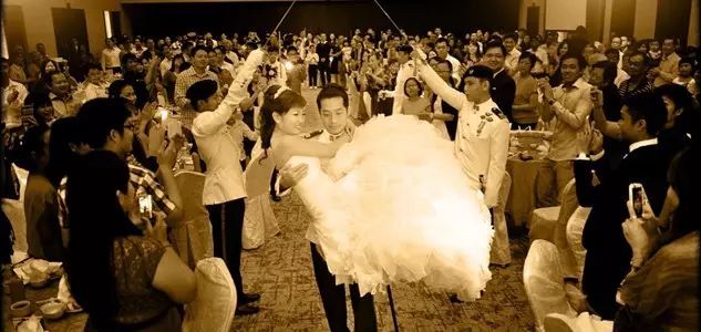 在中国,新郎要迎接新娘都要过五关斩六将,接受伴娘各种“刁难”,在新加坡也不会这么轻易就让你过了剑门。一般为了作弄新人,持剑军官会有意压低手中的剑挡道。新郎和新娘必须完成持剑军官的要求,才能顺利走下去。