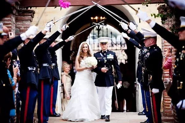 1、军事风格婚礼的最特别之处,除了新郎穿军装现身之外,会有两排军官手持军剑,在过道的上方构成一道延伸的拱门。
