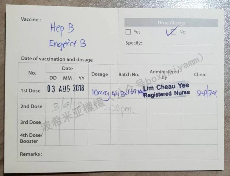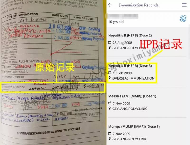 小象是2008年在新加坡出生的,5个多月时,第一次回天津,正好赶上乙肝疫苗第三针的接种。按照接种计划,乙肝疫苗总共分三针,出生第二天、一个月、六个月。在回天津之前,我不放心两地接种是否可行,分别询问了他出生的医院Mount Alvernia Hospital,以及他接种疫苗的社区诊所Geylang Polyclinic,得到的答复是乙肝疫苗国际统一标准,只要记录清楚批次、剂量就可以在中国打。就这样,小象在天津打了乙肝疫苗第三针,打的时候只有国产针剂。回新加坡后,Geylang Polyclinic打电话要求我拿着他的Health Booklet去更新了免疫记录,这件事就这么过了10年。