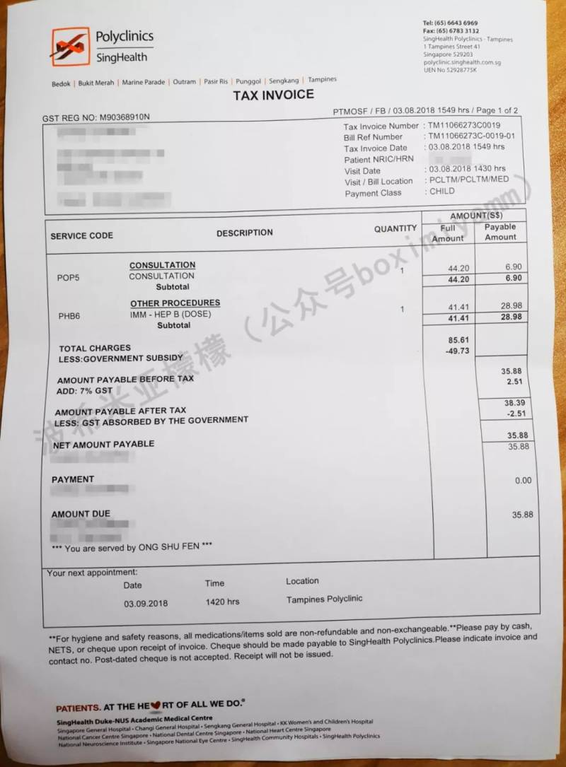 6、费用。第一次看诊及验血,成人是$41.25,儿童是$24.25,可以使用Health Buddy付款,也可以在诊所机器付款,还可以在诊所柜台付款。第二次看报告成人免费,预防针是$35.88,当天忘记带小象的Baby Bonus卡,下次打针一起付。