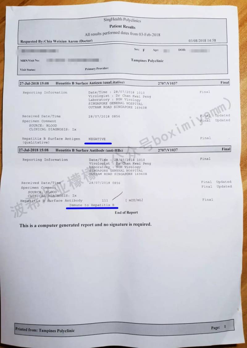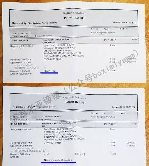 4、检验报告。采血后直接在Polyclinic的机器上预约一周之后看报告,一看到报告,我真是满头黄毛都炸了!打过三针乙肝疫苗的小象,抗体小于10,对乙肝无任何免疫!我在诊室里几乎就要跳起来了,这等于小象不知道从什么时候起,就完全暴露于乙肝病毒之下!我拚命冷静下来,详细询问医生,并综合接种护士的解释,总结以下几点: