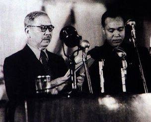 (1938年10月10日,南洋各属商会的代表,在新加坡南洋华侨中学大礼堂举行筹赈祖国难民总会成立大会,图为总会主席陈嘉庚在会上讲话。)