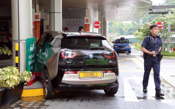 宝马轿车不知何故冲上中峇鲁广场候车处,警方到场调查。