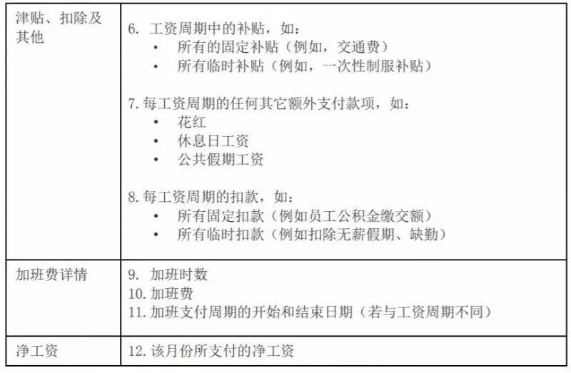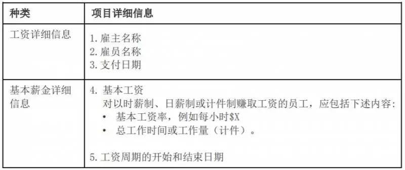 应包括的项目 – 详细薪水单需在适合的情况下包括以下项目: