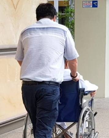 林金兴坐着轮椅,在儿子的陪同下,从医院赶来高庭。(档案照)