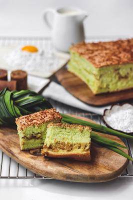该蛋糕的班兰底层使用新鲜班兰叶汁去调味,不添加任何人工调味料。中间夹层则铺满被椰糖浸泡过的椰丝,最后再洒上新鲜椰丝作点缀,吃起来香郁美味。