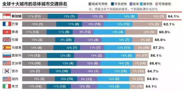 全球交通Top 1最近麦肯锡发布了《全球24个城市交通系统的成功要素》报告,在入榜的十大城市的总体城市交通排名中,新加坡以64.1%的最高总得分名列榜首,领先巴黎、香港、伦敦等城市。